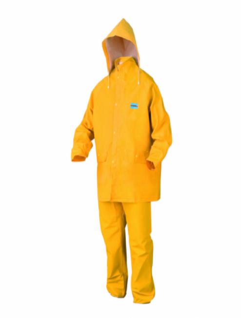 El traje impermeable OMBU es ideal para el uso de la industria, náutica, camping, tareas rurales, pesca, fumigación, lavaderos y toda actividad que requiera protegerse del agua y la humedad. Set de 3 piezas: Campera – Jardinero – Capucha Desmontable