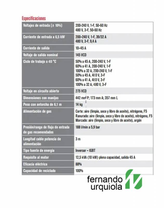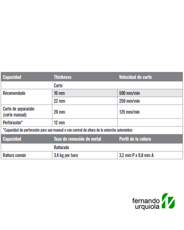 El Powermax45® XP es un sistema de plasma profesional de 45 A para corte, ranurado y marcado, con capacidad de corte recomendada hasta 16 mm, corte de separación hasta 29 mm y perforación hasta 12 mm. Se destacó por su portabilidad, facilidad de uso y alto rendimiento, ofreciendo velocidades de corte superiores al oxicorte y una excelente calidad de acabado, con menos retrabajos.
